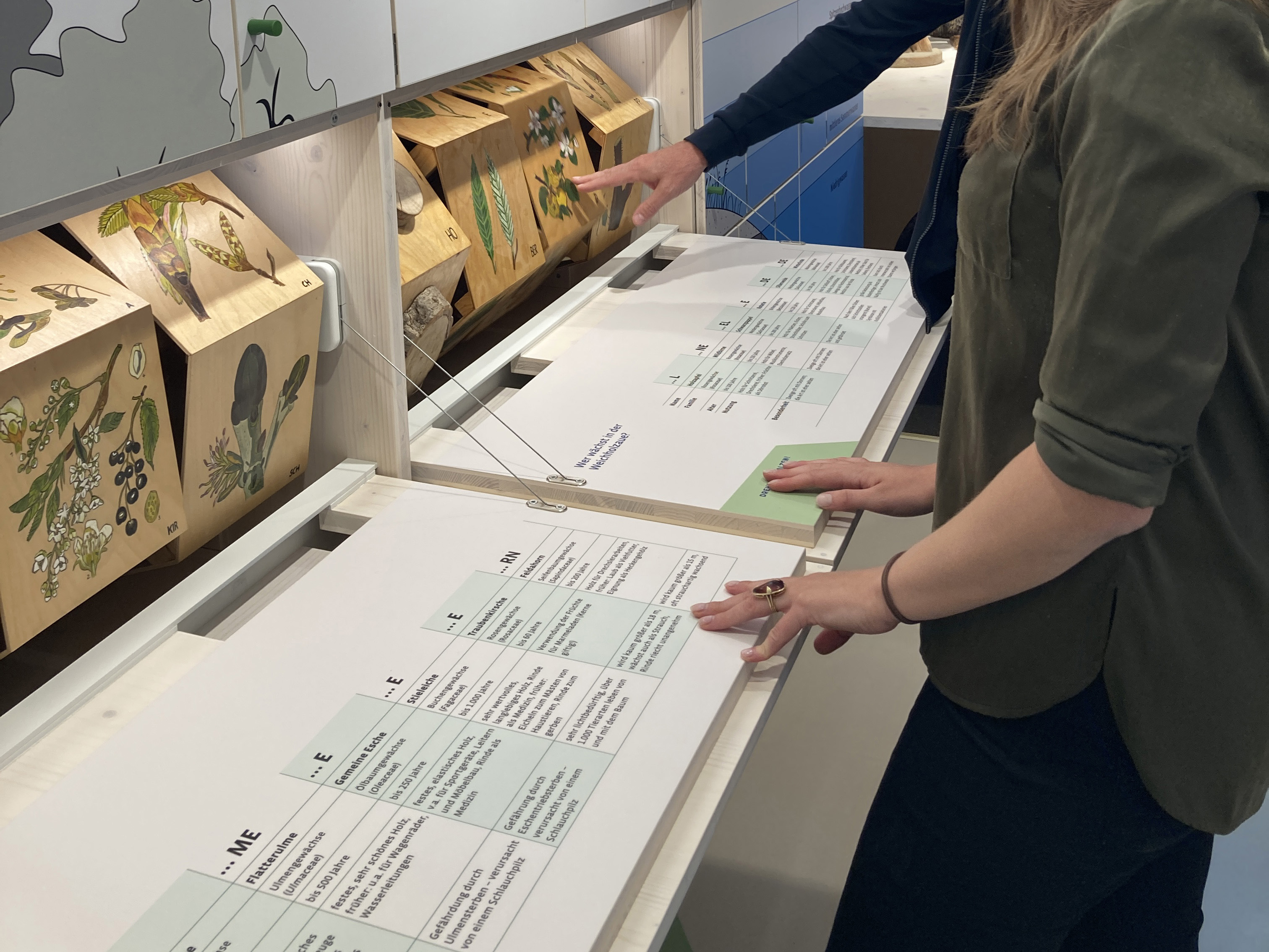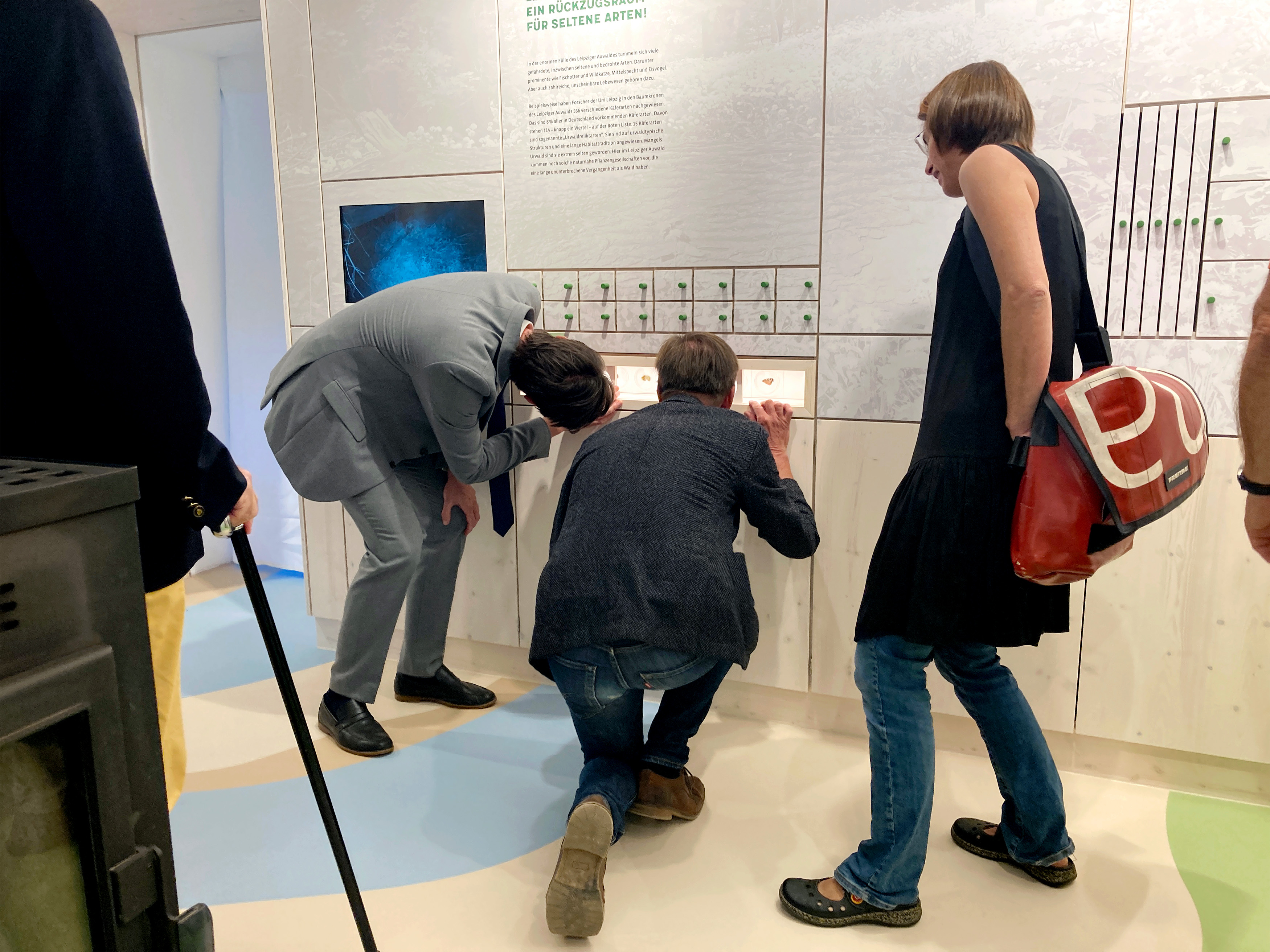 Auf einer ersten Erlebnisebene umhüllt den Raum eine grafisch reduzierte Auwald-Schema-Illustration. Über eine Vielzahl von Klappen, Türen, Auszügen und Schiebeelementen können die Besucher*innen in eine zweite Erlebnisebene eintauchen und unterschiedliche Objekte und Inhalte der Ausstellung unter die Lupe nehmen: So lassen sich u. a. Tierpräparate und integrierte Hands-On-Module wie Drehwalzen, interaktive Lupen oder aber ein Daumenkino entdecken. Ein Kriechtunnel in Form eines Prallhangs und Erdreichs lädt auf Erkundungstour ein, lässt Besucher*innen einem interaktiven Froschkonzert lauschen oder in Dioramen staunen.