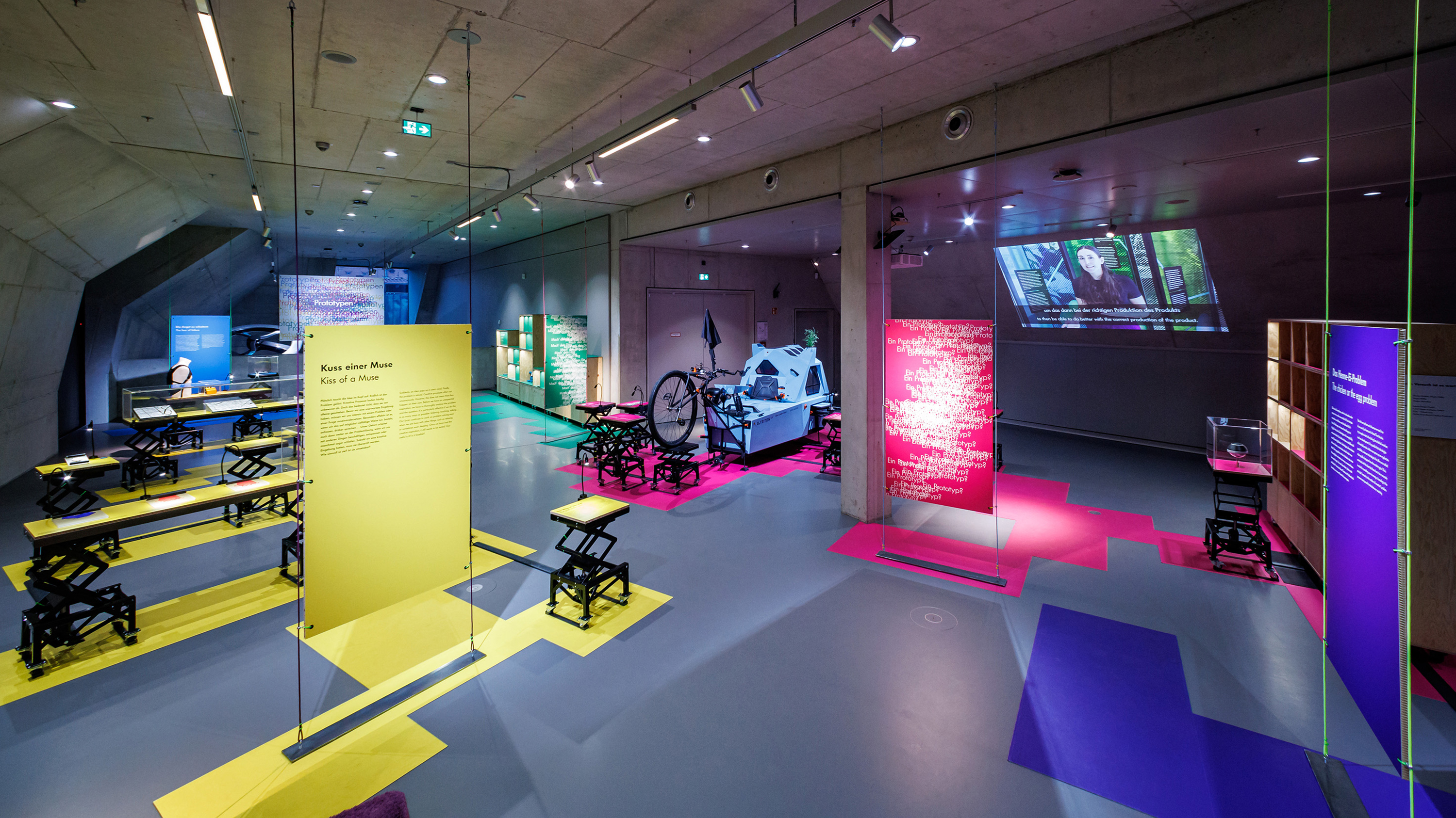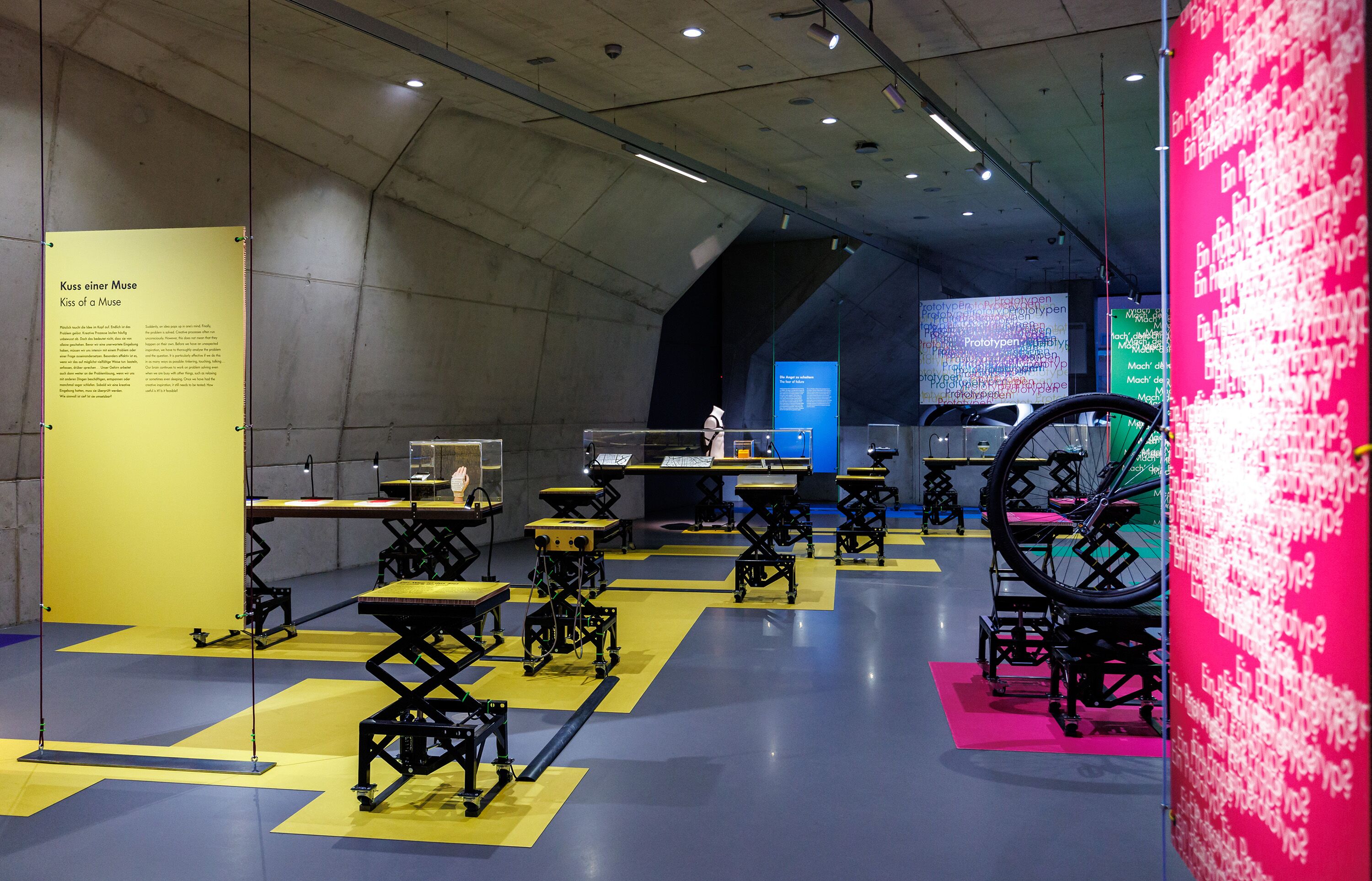 Prozesshaft, unkonventionell, gegen den Strich, experimentell. Um die Merkmale von Prototypen aufzugreifen, spielt das Gestaltungskonzept mit verschiedenen Gestaltungselementen. So zum Beispiel mit den Druckfarben Cyan, Magenta und Yellow, die als Grundfarben der Ausstellungsgrafik dienen und sich im Signet der Ausstellung prozesshaft überlagern. Behutsam und doch augenfällig bricht das Raster der Ausstellung die Ausrichtung des Raumes und schafft neue Perspektiven.