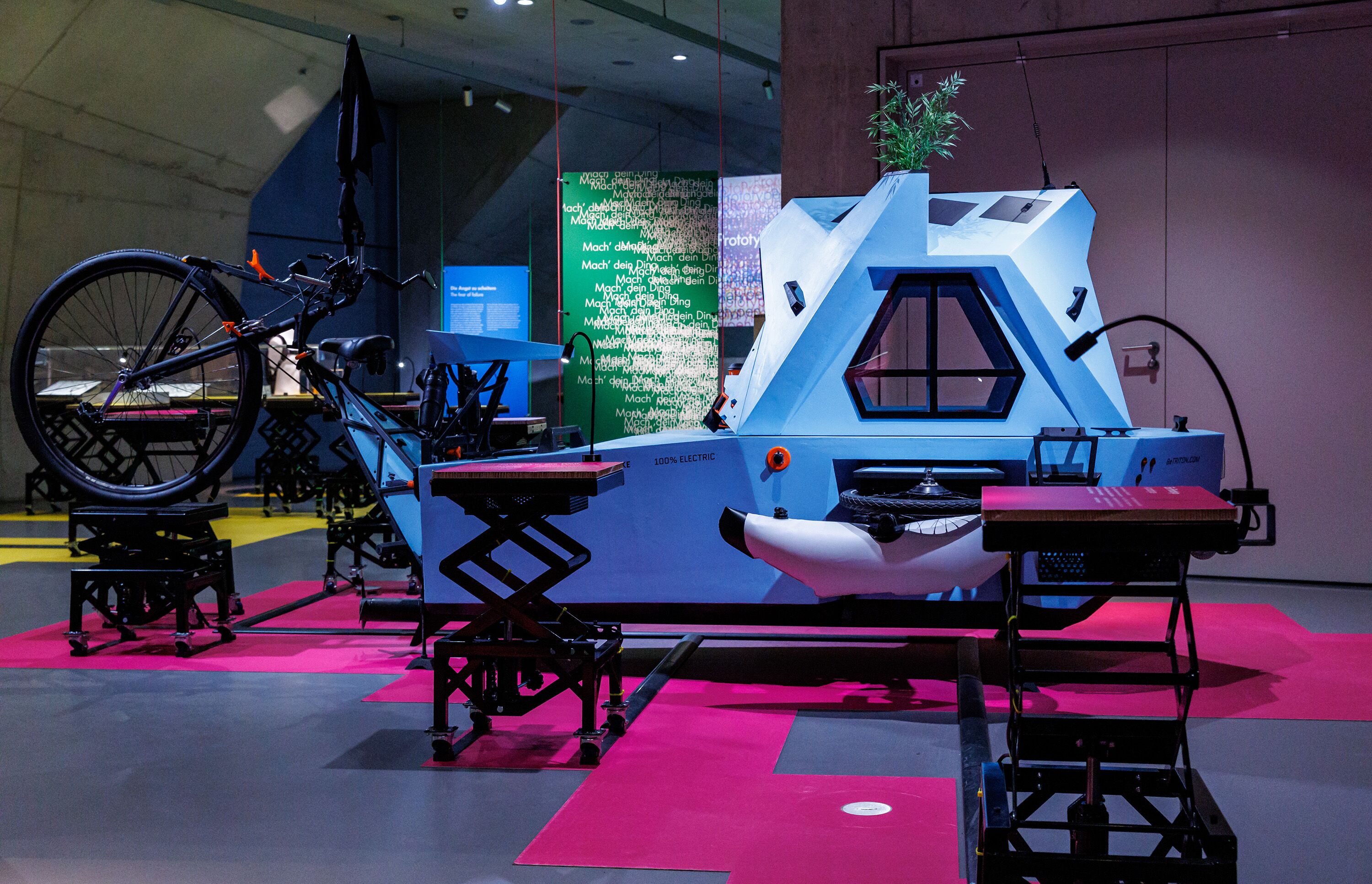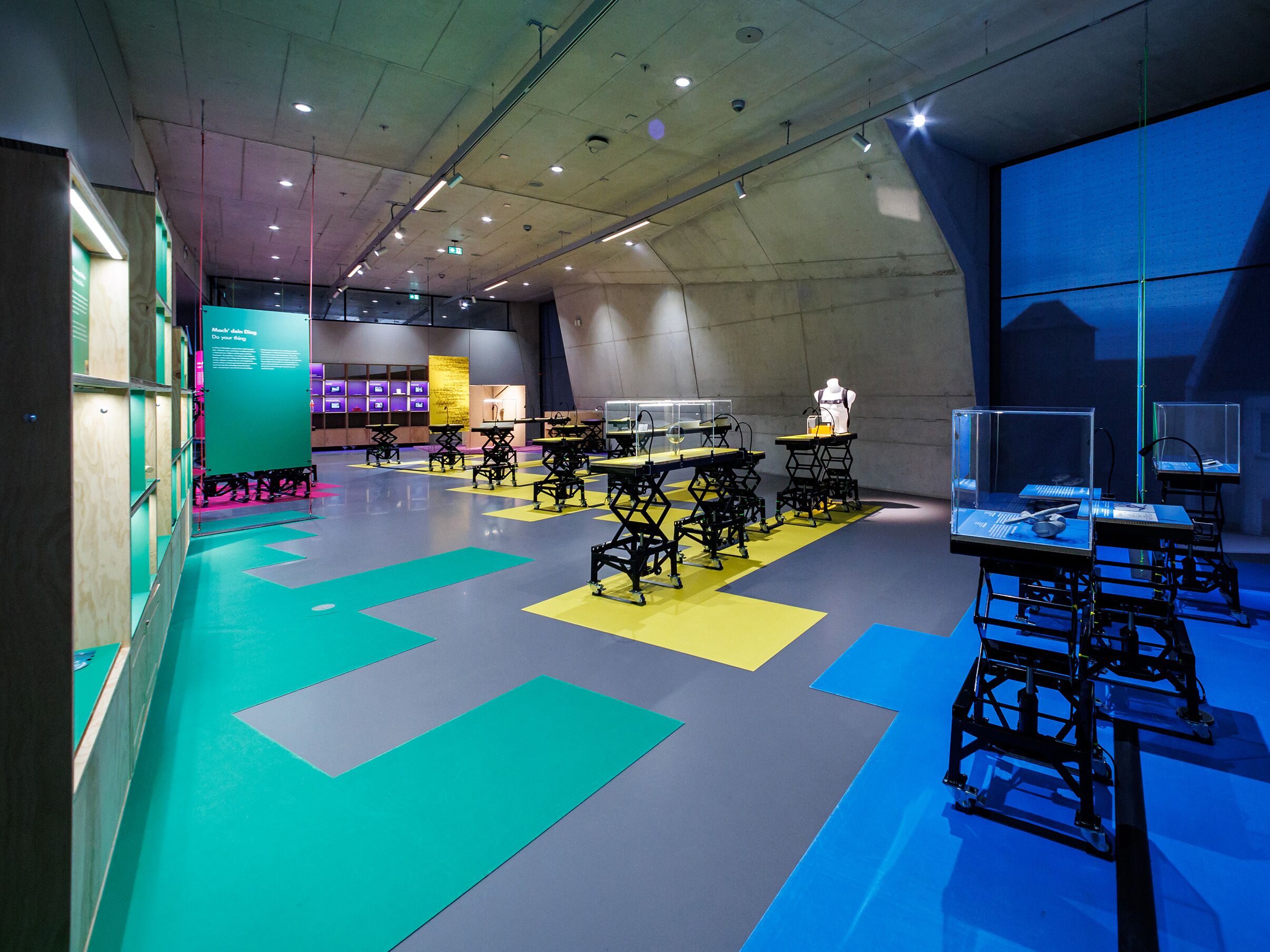 Das zentrale Element der Ausstellungsgestaltung ist ein Ready-Made, das auch im Anschluss an die Ausstellung leicht weiter genutzt werden kann: Scherenhubpodeste als ungewöhnliche und flexible Präsentationsmöbel, die einerseits in der Höhe variieren und andererseits in Kombination mit weiteren Elementen verschiedene räumliche Situationen kreieren können. Ob Vitrine, Tisch, Sitzgelegenheit oder interaktives Exponat, das Scherenhubpodest bildet die räumliche Basis dieser Funktionen. Anders als sonst ist die Kabelzufuhr technischer Installationen, wie beispielsweise LED-Beleuchtung oder Monitore sichtbar geführt. Dies unterstreicht den Charakter des Provisorischen und nimmt atmosphärisch Bezug auf einen Makerspace.