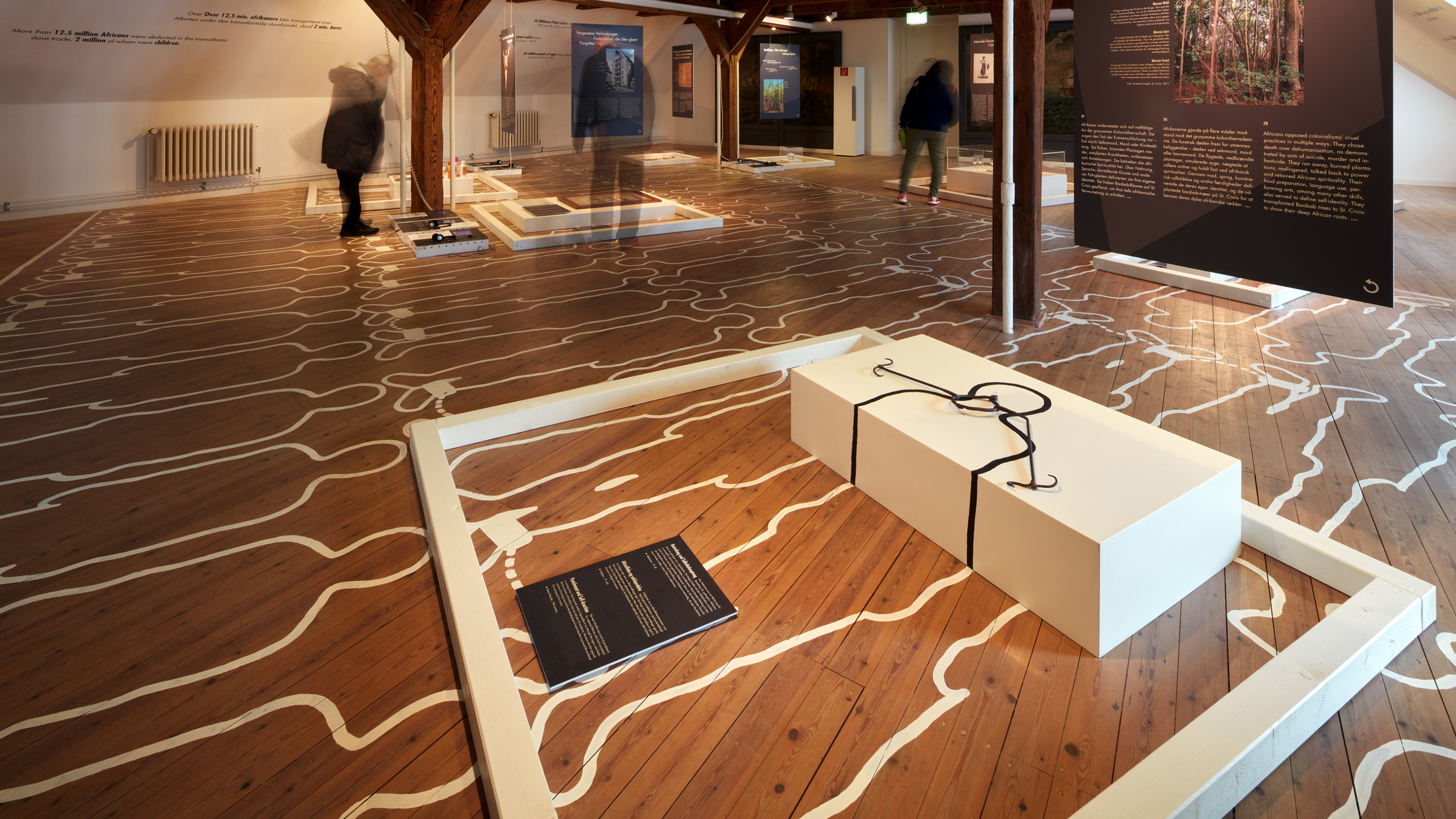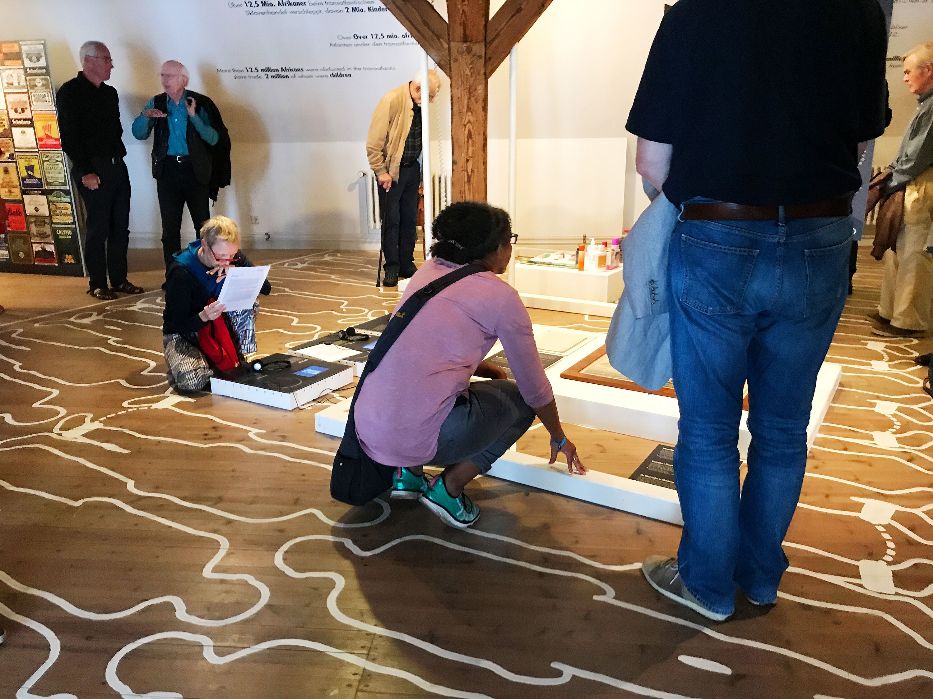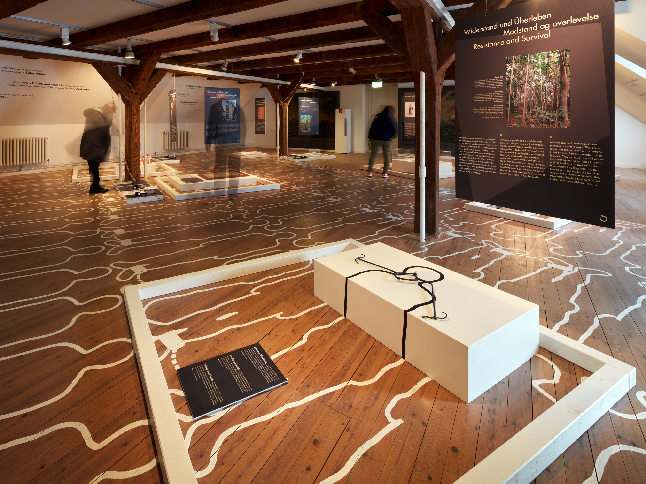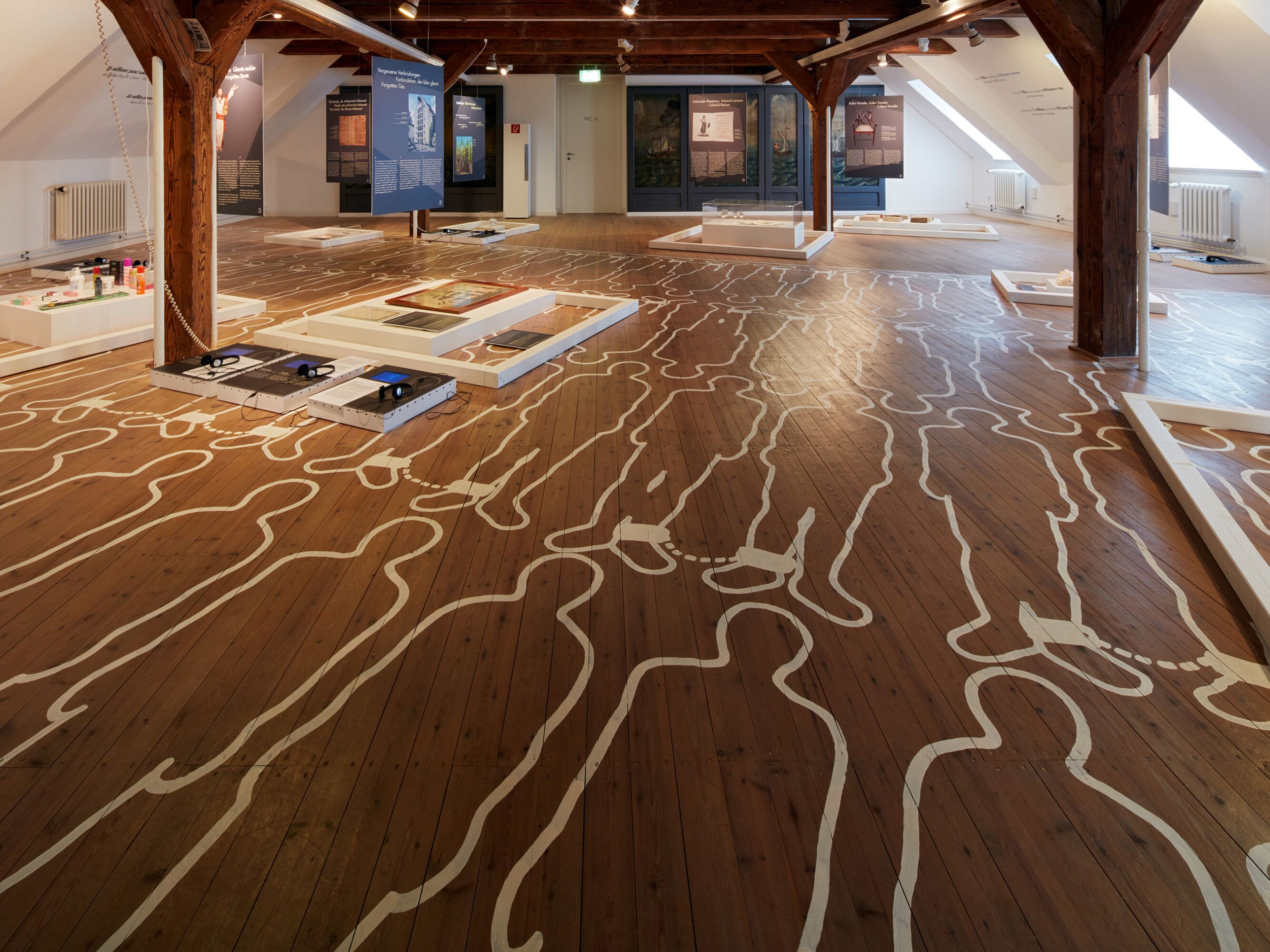 Die Ausstellung will irritieren und Besucher*innen herausfordern. Wer sich informieren möchte, muss sich bücken und eine unbequeme bzw. unübliche „Haltung“ einnehmen, denn alle Exponate sind in Themenboxen auf den Boden präsentiert. Doch auf ihrem Weg dorthin gehen Sie über Menschen. Dicht an dicht, wie in den Sklavenschiffen sind ihre Umrisse auf den Boden gemalt. In weißen Linien – wie an einem Tatort.