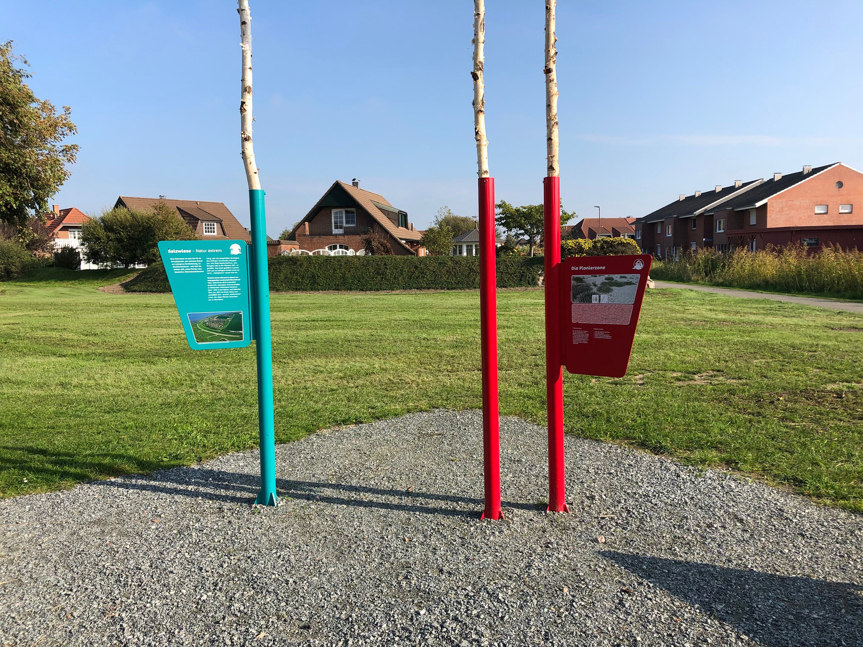 Für die Gestaltung und Umsetzung der Erlebnisstationen wird das Motiv der Pricke aufgegriffen: Pulverbeschichtete Stahlrohre in verschiedenen Farben wurden hierfür im Boden verankert, welche jeweils die Birkenstämme mit ihren typischen Reisigköpfen aufnehmen. Über „vom Winde verwehte“ direkt bedruckte Metalltafeln werden die verschiedenen Inhalte und Themen der Stationen vermittelt. Die hohen Pricken sind weithin in der Ebene sichtbar und stellen damit einen starken Wiedererkennungswert zum Schleswig-Holsteinischen Wattenmmeer her.